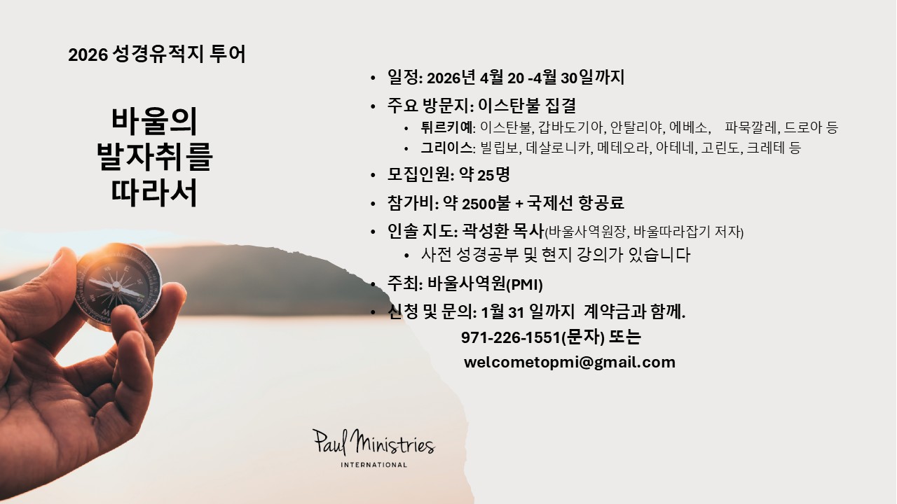 •인솔 지도: 곽성환 목사(바울사역원장, 바울따라잡기 저자 이며 수차례 성지순례 인도)