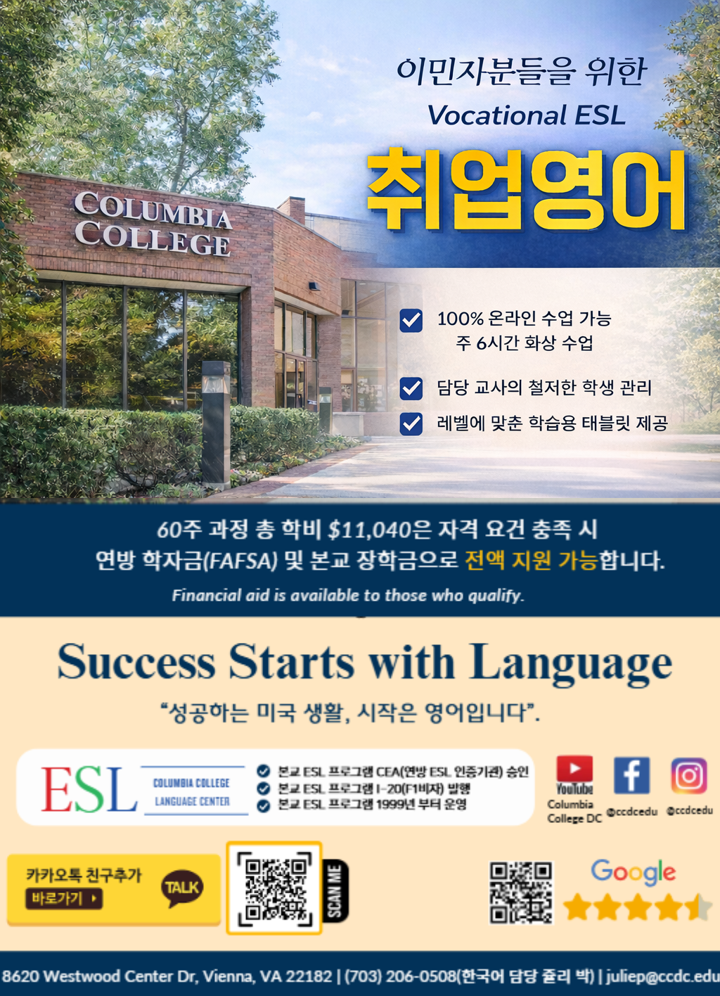 미국 생활과 직장에서 영어 때문에 어려움을 겪고 계신 한인 이민자 분들께 도움이 될 프로그램을 소개드립니다. Columbia College Language Center에서는 초기 이민자를 위한 취업영어(VESL, Vocational ESL) 온라인 프로그램을 운영하고 있습니다.