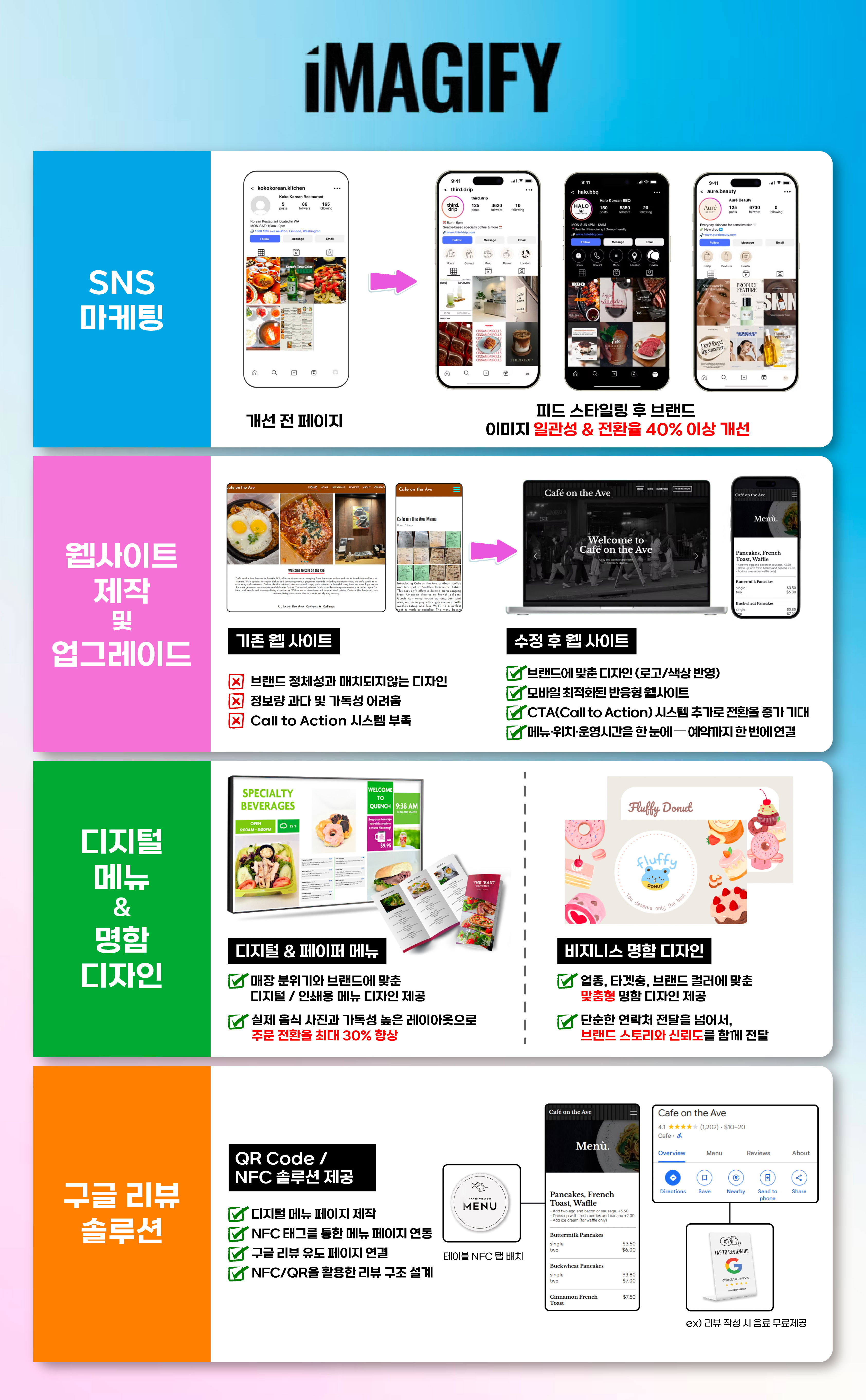 미국에서 한인 비즈니스 대상으로 활동 중인 디지털 마케팅 & 디자인 스튜디오 iMAGIFY입니다.